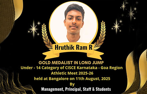 Hruthik Ram R won a gold medal in the Under-14 long jump event at the CISCE Karnataka-Goa Region Athletic Meet 2025–26, held in Bangalore on August 11, 2025. He has now qualified for the national-level competition.