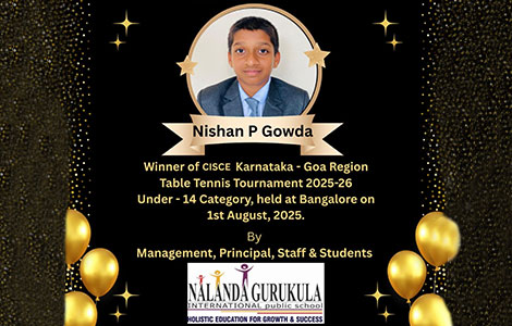 Nishan P Gowda won a gold medal in the Under-14 table tennis event at the CISCE Karnataka-Goa Region Table Tennis Tournament 2025–26, held at St. Mary’s Public School in Bangalore, for his outstanding performance.